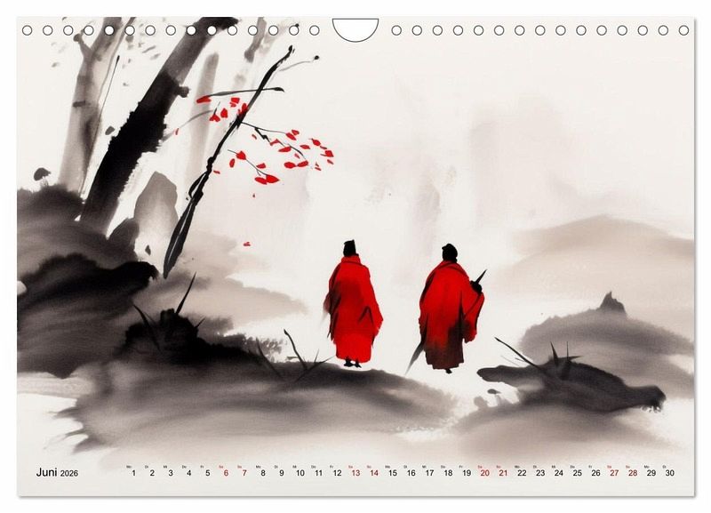Die sehr stark reduzierte Malerei des Zenga Stils überlässt dem Betrachter die Fantasie und läd zum Meditieren über die möglichen Aussagen des Bildes ein. Die ab und zu eingesetzten roten Tupfer lassen den Blick wandern und wirken entspannend auf die Augen. Die Bilder dieses Kalenders wurden mit Hilfe von künstlicher Intelligenz erstellt und in Photoshop zu Ende bearbeitet