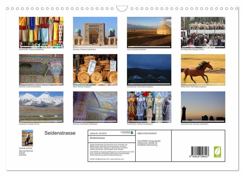 QUALITÄT - Hochwertiger Fotokalender mit 12 wunderschönen Motiven auf lichtbeständigem Bilderdruckpapier, robuste Spiralbindung mit Aufhängebügel.NACHHALTIG - deutliche Abfallreduzierung durch bedarfsgerechte Einzelstückfertigung, umweltfreundliches FSC-zertifiziertes Papier, Produktion in Deutschland, klimabewusste Logistik.PERFEKTES GESCHENK - Kalender für Freunde und Familie, für Kinder und Erwachsene, jung und alt, zu Weihnachten, Geburtstag oder zwischendurch.VIELFALT - Bildkalender in verschiedenen Formaten, z.B. DIN A5, DIN A4, DIN A3 sowie DIN A2. Ob Naturmotiv, Gemälde oder Fotos, ideal für ein persönliches Wohlfühlambiente.Städte, Landschaften und Menschen entlang der Seidenstrasse von Autor(in): samuel schmid
