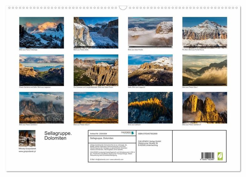 QUALITÄT - Hochwertiger Fotokalender mit 12 wunderschönen Motiven auf lichtbeständigem Bilderdruckpapier, robuste Spiralbindung mit Aufhängebügel.NACHHALTIG - deutliche Abfallreduzierung durch bedarfsgerechte Einzelstückfertigung, umweltfreundliches FSC-zertifiziertes Papier, Produktion in Deutschland, klimabewusste Logistik.PERFEKTES GESCHENK - Kalender für Freunde und Familie, für Kinder und Erwachsene, jung und alt, zu Weihnachten, Geburtstag oder zwischendurch.VIELFALT - Bildkalender in verschiedenen Formaten, z.B. DIN A5, DIN A4, DIN A3 sowie DIN A2. Ob Naturmotiv, Gemälde oder Fotos, ideal für ein persönliches Wohlfühlambiente.Wildromantische Bergpanoramen der Sellagruppe von Autor(in): Gospodarek Mikolaj