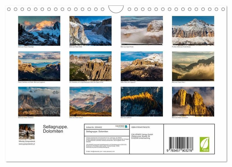QUALITÄT - Hochwertiger Fotokalender mit 12 wunderschönen Motiven auf lichtbeständigem Bilderdruckpapier, robuste Spiralbindung mit Aufhängebügel.NACHHALTIG - deutliche Abfallreduzierung durch bedarfsgerechte Einzelstückfertigung, umweltfreundliches FSC-zertifiziertes Papier, Produktion in Deutschland, klimabewusste Logistik.PERFEKTES GESCHENK - Kalender für Freunde und Familie, für Kinder und Erwachsene, jung und alt, zu Weihnachten, Geburtstag oder zwischendurch.VIELFALT - Bildkalender in verschiedenen Formaten, z.B. DIN A5, DIN A4, DIN A3 sowie DIN A2. Ob Naturmotiv, Gemälde oder Fotos, ideal für ein persönliches Wohlfühlambiente.Wildromantische Bergpanoramen der Sellagruppe von Autor(in): Gospodarek Mikolaj