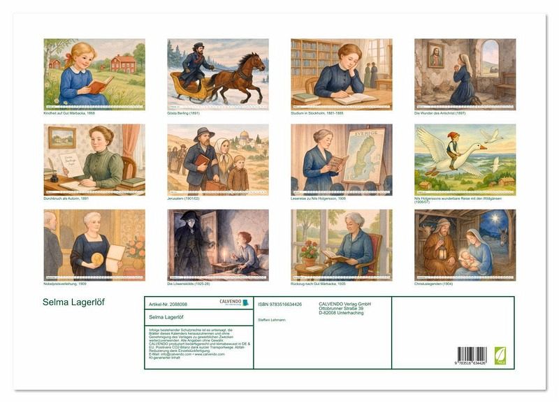 Tauchen Sie ein in das faszinierende Leben und Werk der ersten Literaturnobelpreisträgerin: Selma Lagerlöf. Dieser liebevoll illustrierte Kalender im Stil klassischer Aquarellbilder, die Steffani Lehmann mit Unterstützung einer KI editiert hat, zeigt zwölf stimmungsvollen Szenen. Ein poetischer Blick auf eine außergewöhnliche Frau und ihre Geschichten, ideal für Literaturfreunde und Schwedenfans.