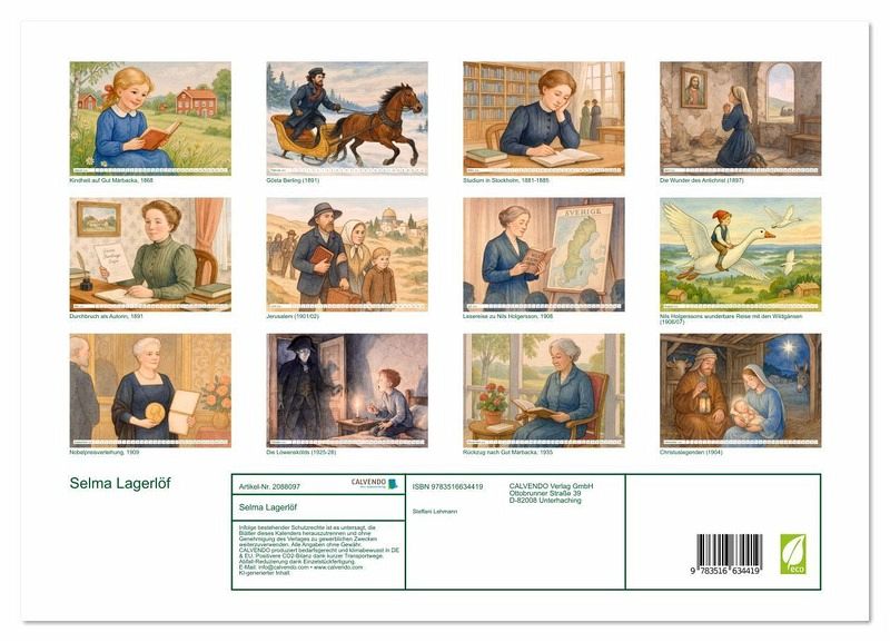 Tauchen Sie ein in das faszinierende Leben und Werk der ersten Literaturnobelpreisträgerin: Selma Lagerlöf. Dieser liebevoll illustrierte Kalender im Stil klassischer Aquarellbilder, die Steffani Lehmann mit Unterstützung einer KI editiert hat, zeigt zwölf stimmungsvollen Szenen. Ein poetischer Blick auf eine außergewöhnliche Frau und ihre Geschichten, ideal für Literaturfreunde und Schwedenfans.