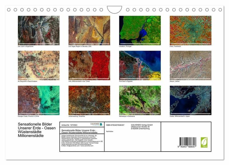 Jetzt haben Sie Ihr perfektes Geschenk für das ganze Jahr gefunden. Einzigartige fantastische Ansichten kleiner und großer Städte welche die Menschen in Tausenden Jahren geschaffen haben. Traumhafte Bilder voller schillernder Farben und bizarrer Formen für Liebhaber der brillanter Fotografie und eindrucksvoller Kunst gleichermaßen. Satelliten der NASA waren jahrelang im Einsatz, um viele Gebiete der Erde und deren Veränderungen zu erkunden.