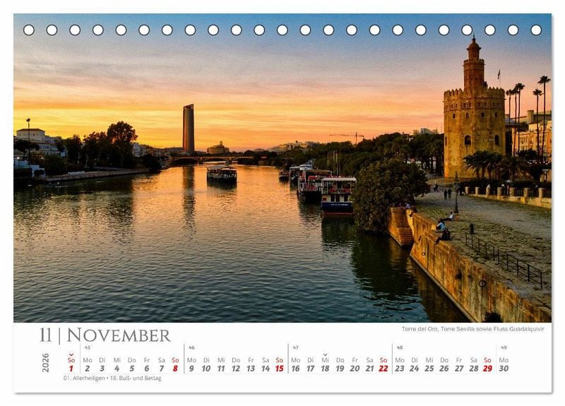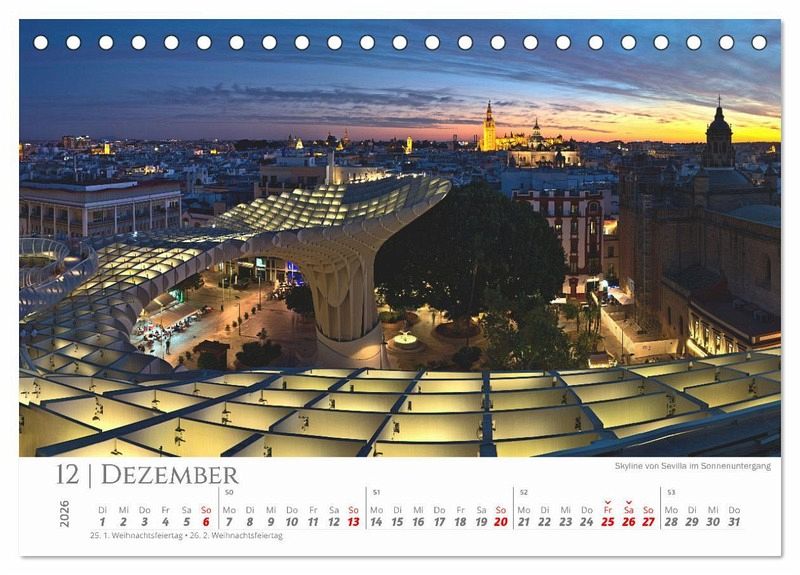 Sevilla, die Hauptstadt des südspanischen Andalusiens und eine der Wiegen des Flamencos bietet seinen BesucherInnen nicht nur ein mediterranes Klima, sondern auch eine abwechslungsreiche Kulisse an Sehenswürdigkeiten. Zu den wichtigsten Attraktionen zählen der kunstvolle Alcázar-Palast, die Stierkampfarena aus dem 18. Jh. sowie die gotische Kathedrale mit dem berühmten Glockenturm Giralda. Die schönsten Flecken der Stadt werden in einem beeindruckenden Kalender präsentiert und sollen zum Träumen anregen, das spanische Flair vermitteln sowie Lust auf Urlaub machen. Das ideale Geschenk für alle Spanien- und Reisefans.