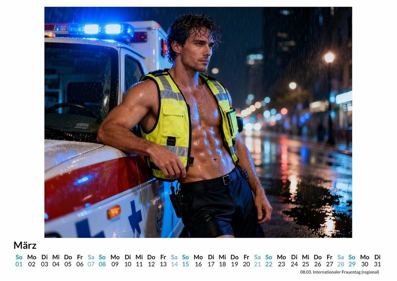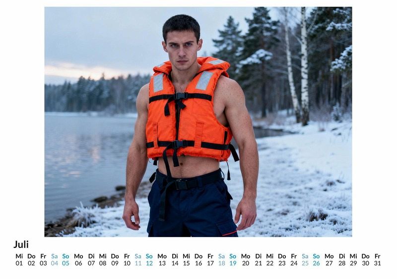 Wenn der Puls steigt, sind sie zur Stelle. Dieser Einsatz ist jedoch ein besonderer. Der Kalender "Sexy Sanitäter" fängt Momente voller Spannung und Kraft ein. Er präsentiert die Helden des Alltags in einer Komposition aus Professionalität und freizügiger Ästhetik. Jeder Monat enthüllt eine neue Facette dieser ungewöhnlichen Darstellung. Der Kalender ist eine passende Wahl für: Personen, die Uniformen mit einem provokanten Twist mögen. Als Geschenkidee für Anlässe wie Junggesellinnenabschiede. Alle, die ästhetische Darstellungen des männlichen Körpers schätzen. Die zwölf Monatsblätter zeigen durchtrainierte Männer in ihrer Rolle als Retter. Die Rettungsweste liegt direkt auf dem nackten Oberkörper, die Hose sitzt tief und betont die Statur. Der intensive Blick ist stets direkt in die Kamera gerichtet und fesselt die Aufmerksamkeit. Diese Bilder wurden durch die Macht moderner Algorithmen zum Leben erweckt und stellen eine fiktive Interpretation des Themas dar. Was der Kalender bietet: Ein Wandkalender mit 12 Monatsseiten plus Deckblatt. Praktisches Kalendarium für die Organisation von Terminen. Jeden Monat ein neues, thematisch passendes Motiv. Der Kalender "Sexy Sanitäter" ist eine Interpretation des Retter-Themas, umgesetzt auf eine kühne und unkonventionelle Weise. Er begleitet durch das Jahr mit Bildern, die Stärke und Selbstbewusstsein ausstrahlen. Es ist Zeit, die Motive selbst zu entdecken.