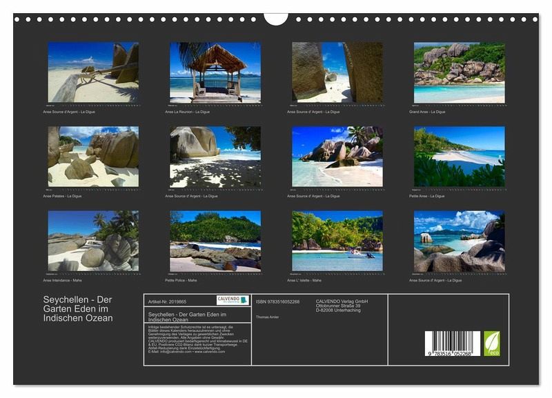 QUALITÄT - Hochwertiger Fotokalender mit 12 wunderschönen Motiven auf lichtbeständigem Bilderdruckpapier, robuste Spiralbindung mit Aufhängebügel.NACHHALTIG - deutliche Abfallreduzierung durch bedarfsgerechte Einzelstückfertigung, umweltfreundliches FSC-zertifiziertes Papier, Produktion in Deutschland, klimabewusste Logistik.PERFEKTES GESCHENK - Kalender für Freunde und Familie, für Kinder und Erwachsene, jung und alt, zu Weihnachten, Geburtstag oder zwischendurch.VIELFALT - Bildkalender in verschiedenen Formaten, z.B. DIN A5, DIN A4, DIN A3 sowie DIN A2. Ob Naturmotiv, Gemälde oder Fotos, ideal für ein persönliches Wohlfühlambiente.Mitten im Indischen Ozean findet man ein Naturparadies von traumhafter Schönheit. Mit diesem Kalender möchte ich Ihnen einen kleinen Eindruck von der einzigartigen Inselwelt der Seychellen vermitteln. von Autor(in): Thomas Amler