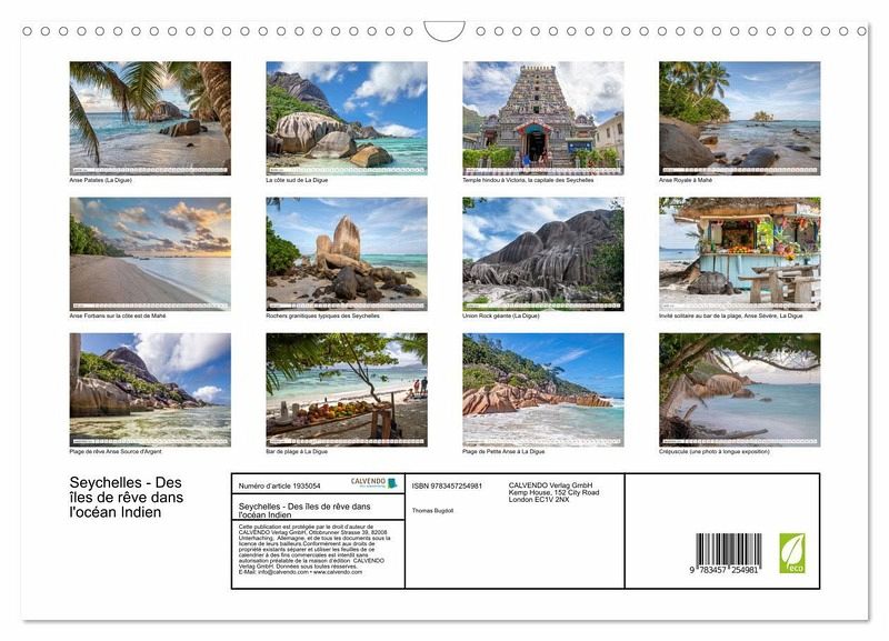 Découvrez le paradis. Laissez-vous enchanter par les plages à couper le souffle et la nature luxuriante des Seychelles ! Avec notre calendrier exclusif, nous vous emmenons mois après mois sur les plages de rêve de l'Océan Indien. Vos vacances personnelles à la maison Le calendrier vous montre des paysages spectaculaires sur Mahé et La Digue. Découvrez la magie des îles qui captive chaque année des milliers de voyageurs. Parfait pour les amoureux de la nature et les passionnés de voyages. Ce calendrier est plus qu'un simple chronomètre : c'est une fenêtre sur l'un des plus beaux endroits du monde. Offrez-vous ou offrez à vos proches un morceau de vacances et laissez-vous inspirer par la beauté des Seychelles. Commandez maintenant et ramenez les Seychelles à la maison.