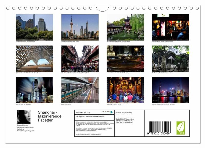 Dieser Kalender zeigt eine bunte Mischung stimmungsvoller Bilder aus der chinesischen Metropole Shanghai. Die fesselnden Fotografien stammen zum Teil von einheimischen Fotokünstlern, welche die Eindrücke dieser faszinierenden Stadt aus ihren ganz eigenen Perspektiven wiedergeben. Das passende Geschenk für alle die aufregende Städtereisen lieben.
