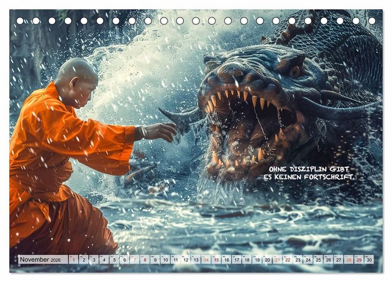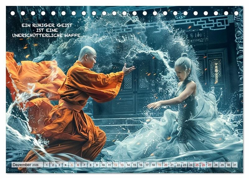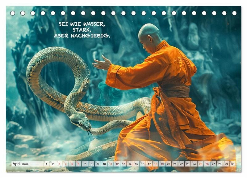 Erleben Sie die perfekte Verbindung von Körper und Geist, meditative Stille und die tiefgründige Weisheit der Mönche. Lassen Sie sich jeden Monat neu inspirieren und finden Sie Kraft in den Lehren der Shaolin. Erstellt wurden die Illustrationen mit KI und Photoshop.