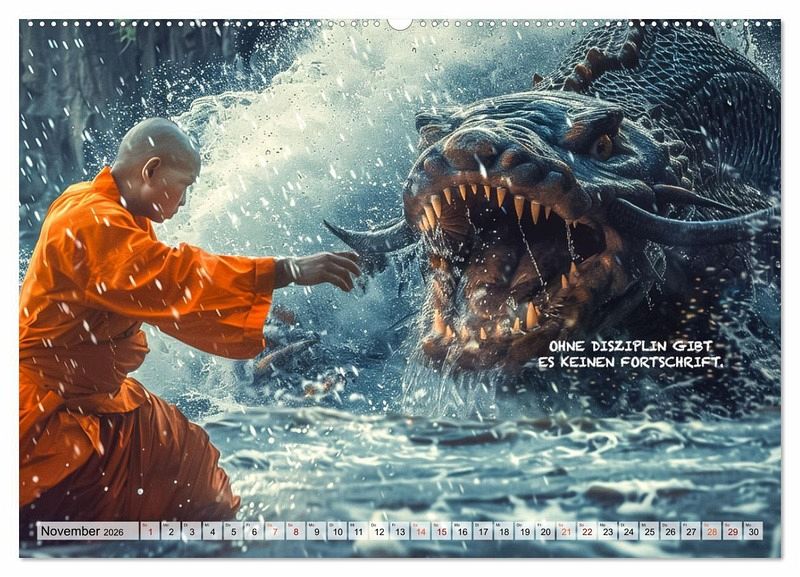 Erleben Sie die perfekte Verbindung von Körper und Geist, meditative Stille und die tiefgründige Weisheit der Mönche. Lassen Sie sich jeden Monat neu inspirieren und finden Sie Kraft in den Lehren der Shaolin. Erstellt wurden die Illustrationen mit KI und Photoshop.