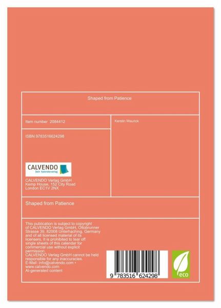 We care about the environment. That's why we only use FSC-certified paper from responsible forestry. We avoid overproduction and thus significant amounts of waste as we produce our calendars via print-on-demand in the markets we operate in. This means we can keep our transport routes short and ensure climate-conscious logistical processes.14 Pages Consisting of 1 Cover 12 Months 1 Index Page I Cardboard Spine at the Back.