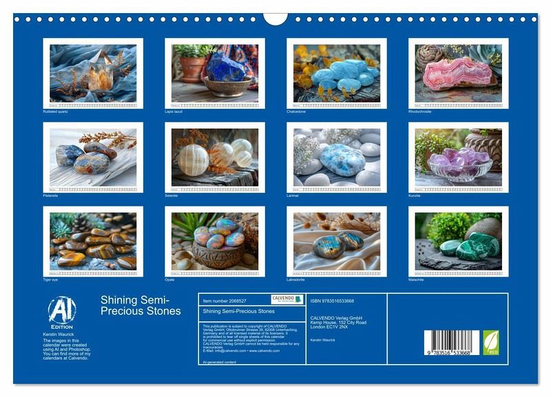 QUALITY - High-quality photo calendar with 12 beautiful images on light-resistant paper, robust spiral binding with hanger.SUSTAINABLE - Significant waste reduction due to print-on-demand production, environmentally friendly FSC-certified paper, produced in the UK, climate-conscious logistical processes.PERFECT GIFT - calendars for friends and family, for children, all ages and all occasions, from Christmas to birthdays and everything in between.LOTS OF CHOICE - Wall calendars in different sizes (DIN A4 and DIN A3), for any topic and personal taste, featuring photography, painting and illustrations.Gemstones - the colorful magic of nature, author: Kerstin Waurick