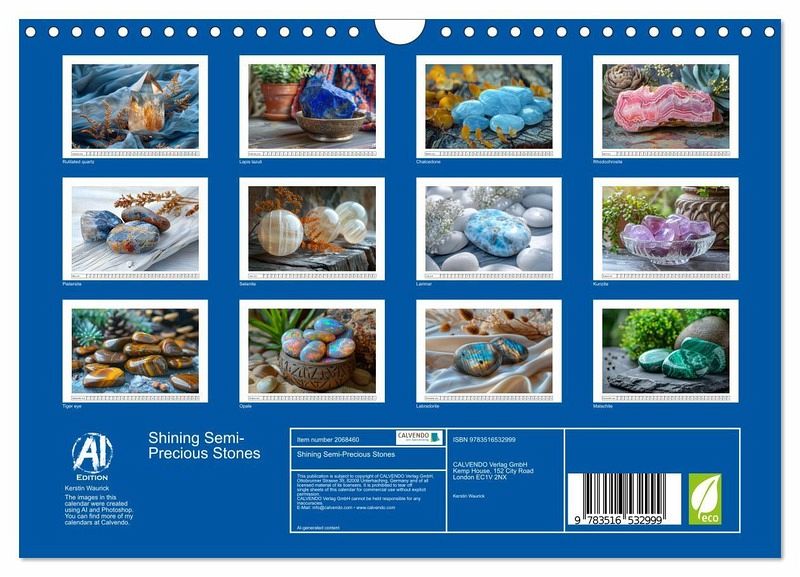 QUALITY - High-quality photo calendar with 12 beautiful images on light-resistant paper, robust spiral binding with hanger.SUSTAINABLE - Significant waste reduction due to print-on-demand production, environmentally friendly FSC-certified paper, produced in the UK, climate-conscious logistical processes.PERFECT GIFT - calendars for friends and family, for children, all ages and all occasions, from Christmas to birthdays and everything in between.LOTS OF CHOICE - Wall calendars in different sizes (DIN A4 and DIN A3), for any topic and personal taste, featuring photography, painting and illustrations.Gemstones - the colorful magic of nature, author: Kerstin Waurick