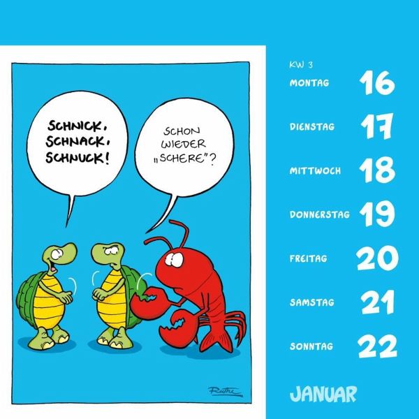 Mit diesem Cartoon-Kalender für 2023 kann man sich gegen jedes Unheil wappnen und auch seine Mitmenschen mit Humor versorgen, weil hier die sagenhaften Shit happens!-Cartoons von Ralph Ruhte auf eine perforierte Postkarte gedruckt sind. So lassen sie sich ganz leicht abtrennen und verschicken.