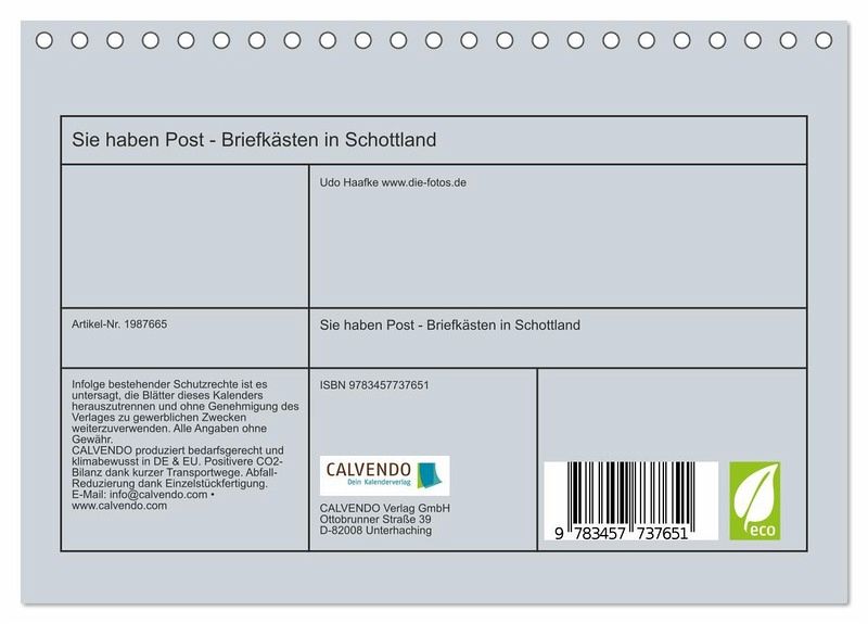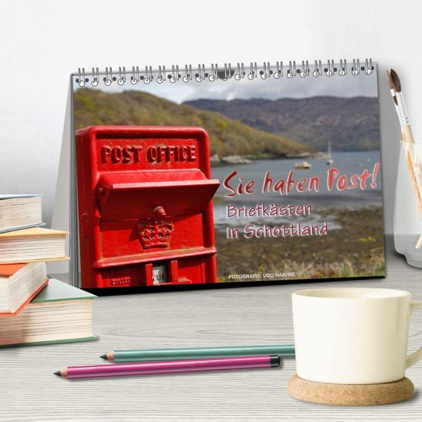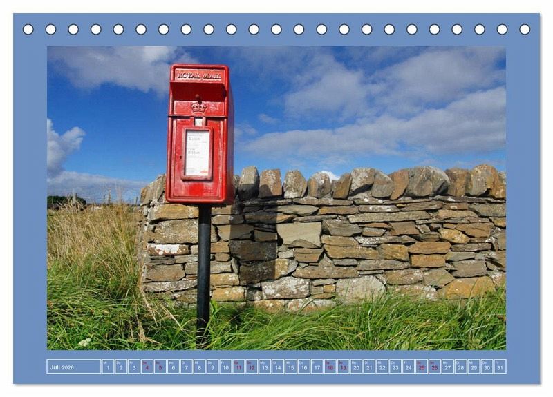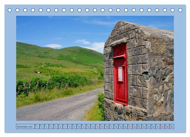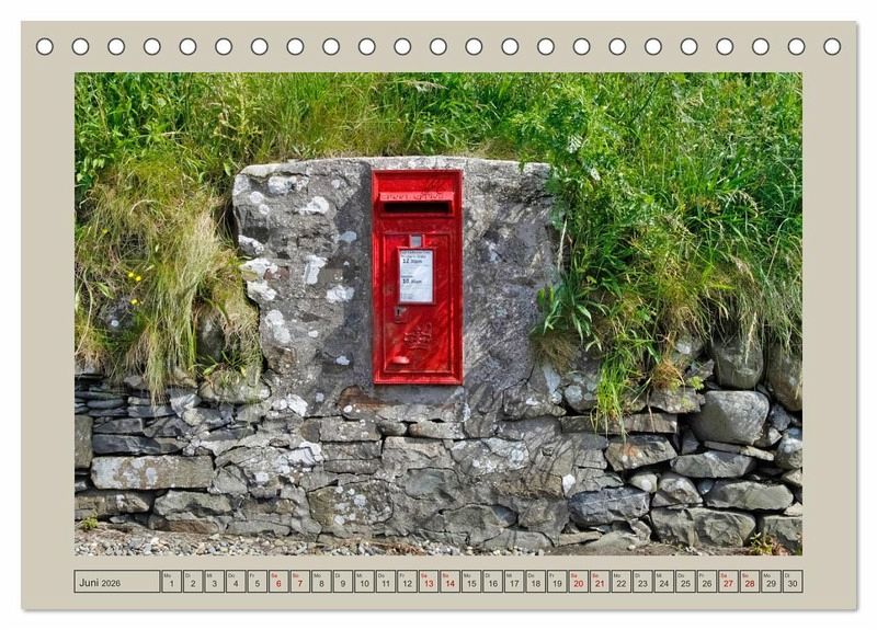 Die kleinen roten Briefkästen der britischen Royal Mail gehören in Schottland zum unverwechselbaren und typischen Landschaftsbiild. Sie finden sich in diesem Kalender an iknoischen Plätzen ebenso wie in tierischer Gesellschaft und stehen symbolisch für eine große Tradition.