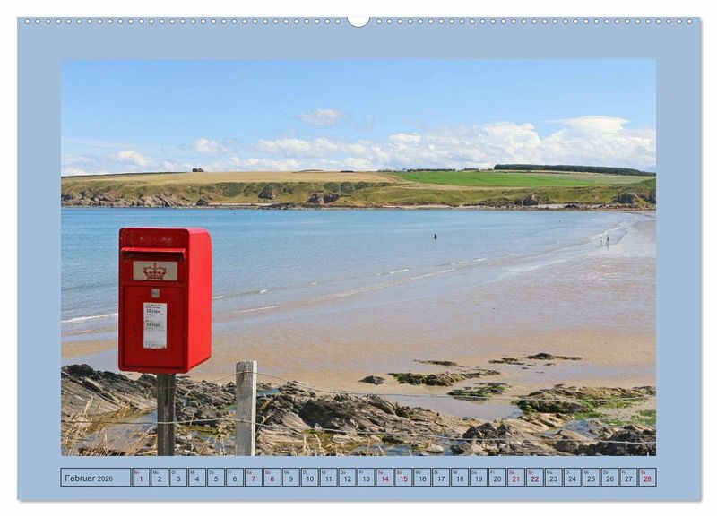 Die kleinen roten Briefkästen der britischen Royal Mail gehören in Schottland zum unverwechselbaren und typischen Landschaftsbiild. Sie finden sich in diesem Kalender an iknoischen Plätzen ebenso wie in tierischer Gesellschaft und stehen symbolisch für eine große Tradition.