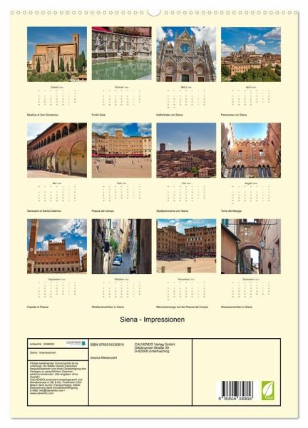 PREMIUM-LINIE - Brillanter Fotokalender mit 12 wunderschönen Motiven, Kunstdruck in Hochglanz in Museumsqualität.QUALITÄT - edle Materialien, stabile Rückwand mit 2 innovativen Einstecktaschen für eine optimale Präsentation an der Wand.NACHHALTIG - deutliche Abfallreduzierung durch bedarfsgerechte Einzelstückfertigung, umweltfreundliches FSC-zertifiziertes Papier, Produktion in Deutschland, klimabewusste Logistik.PERFEKTES GESCHENK - Kalender für Freunde und Familie, für Kinder und Erwachsene, jung und alt, zu Weihnachten, Geburtstag oder zwischendurch.Dieser Kalender zeigt die schönsten Seiten von Siena, der Stadt inder Toskana von Autor(in): Jessis Fotoecke