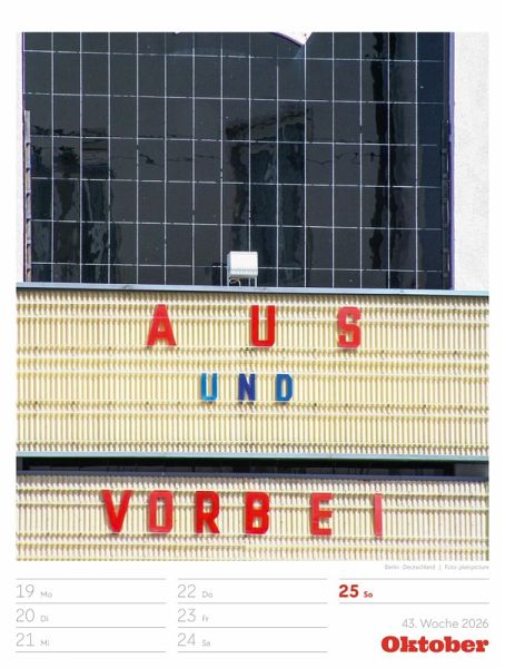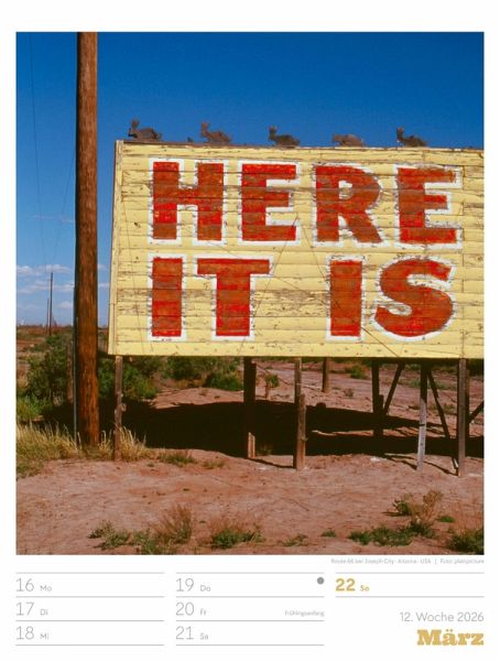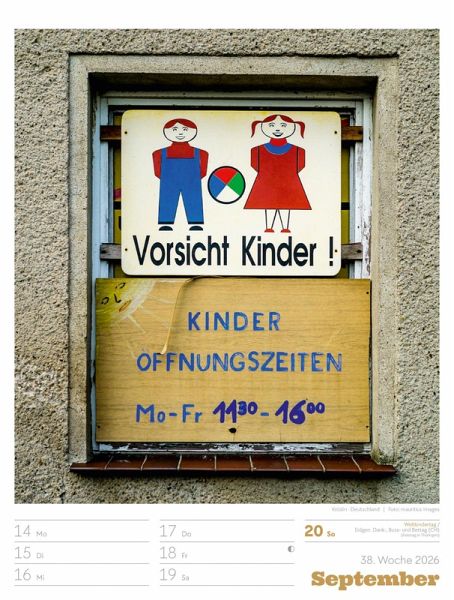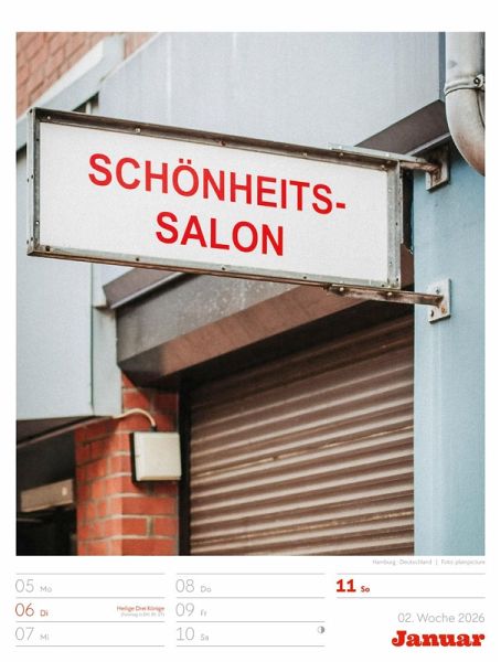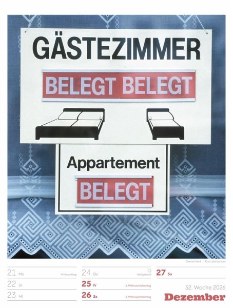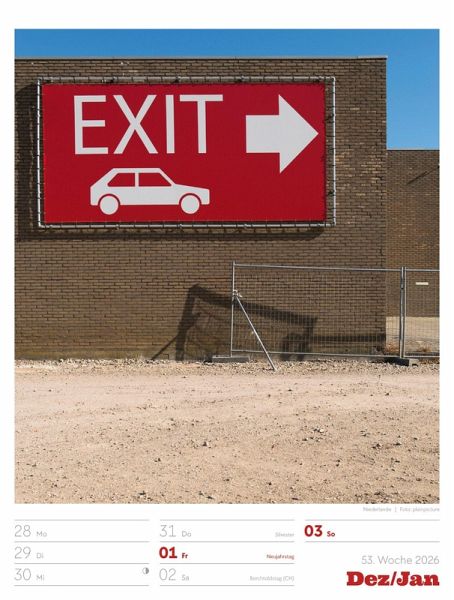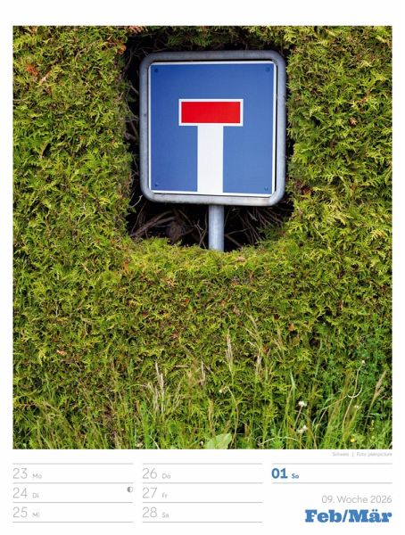 Wochenkalender mit 53 augenzwinkernden Bildern von Schildern, gespickt mit subtilem Humor und lakonischer Ironie Schilder-Kalender im Hochformat: 25x33 cm Mit übersichtlichem Eintragekalendarium sowie Kreuzworträtseln und Sudokus auf jeder Rückseite Auf Papier aus nachhaltiger Forstwirtschaft in Deutschland produziert, mit Spiralbindung Leistet einen Beitrag zum Ackermann Firmenwald Deutschsprachiges Kalendarium