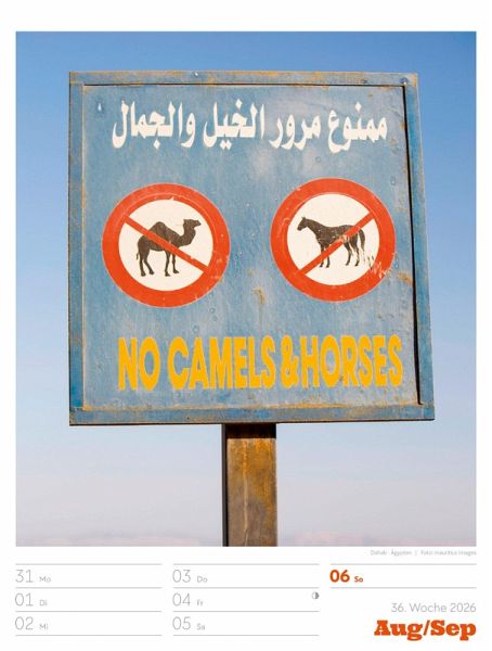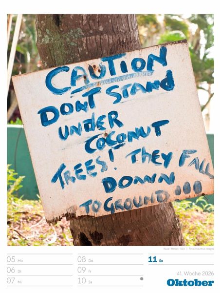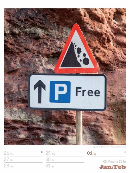 Entdecken Sie mit dem Kalender "Signs" die Vielfalt der Welt durch die Linse witziger und skurriler Schilder! Diese einzigartige Sammlung von Fotografien zeigt Schilder an verschiedenen Orten, die nicht nur humorvoll sind, sondern auch das Leben der Menschen vor Ort lebendig widerspiegeln. Von charmanten lokalen Hinweisen bis hin zu unerwarteten Anweisungen und Informationen: Lassen Sie sich von diesen visuellen Botschaften inspirieren und tauchen Sie in augenzwinkernd-philosophische Bilder- und Schildergeschichten ein! Übersichtliches Kalendarium mit Platz für Ihre Einträge und dazu jede Woche neuer Rätselspaß: Kreuzworträtsel und Sudokus auf allen Rückseiten.