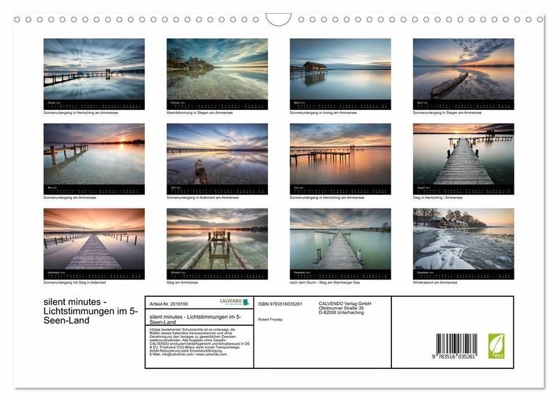QUALITÄT - Hochwertiger Fotokalender mit 12 wunderschönen Motiven auf lichtbeständigem Bilderdruckpapier, robuste Spiralbindung mit Aufhängebügel.NACHHALTIG - deutliche Abfallreduzierung durch bedarfsgerechte Einzelstückfertigung, umweltfreundliches FSC-zertifiziertes Papier, Produktion in Deutschland, klimabewusste Logistik.PERFEKTES GESCHENK - Kalender für Freunde und Familie, für Kinder und Erwachsene, jung und alt, zu Weihnachten, Geburtstag oder zwischendurch.VIELFALT - Bildkalender in verschiedenen Formaten, z.B. DIN A5, DIN A4, DIN A3 sowie DIN A2. Ob Naturmotiv, Gemälde oder Fotos, ideal für ein persönliches Wohlfühlambiente.Lichtstimmungen von Seen und Stegen von Autor(in): Robert Freytag