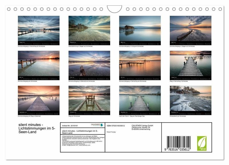 QUALITÄT - Hochwertiger Fotokalender mit 12 wunderschönen Motiven auf lichtbeständigem Bilderdruckpapier, robuste Spiralbindung mit Aufhängebügel.NACHHALTIG - deutliche Abfallreduzierung durch bedarfsgerechte Einzelstückfertigung, umweltfreundliches FSC-zertifiziertes Papier, Produktion in Deutschland, klimabewusste Logistik.PERFEKTES GESCHENK - Kalender für Freunde und Familie, für Kinder und Erwachsene, jung und alt, zu Weihnachten, Geburtstag oder zwischendurch.VIELFALT - Bildkalender in verschiedenen Formaten, z.B. DIN A5, DIN A4, DIN A3 sowie DIN A2. Ob Naturmotiv, Gemälde oder Fotos, ideal für ein persönliches Wohlfühlambiente.Lichtstimmungen von Seen und Stegen von Autor(in): Robert Freytag