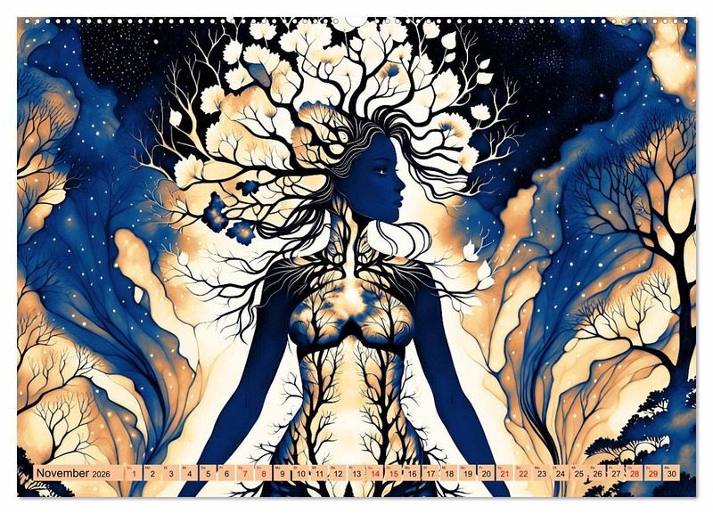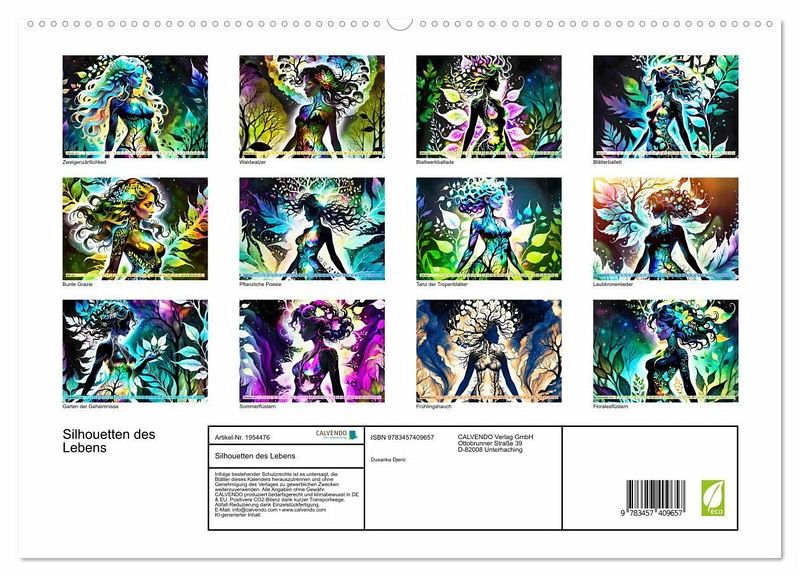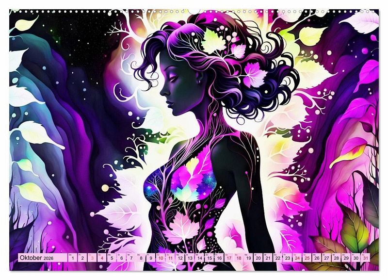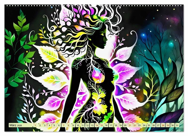 Tauchen Sie ein in die Welt der Natur und Schönheit mit unserem exklusiven Kalender, kreiert durch die Kraft künstlicher Intelligenz. Jedes Blatt entfaltet eine einzigartige Frauensilhouette, kunstvoll bemalt mit Elementen der Natur. Lassen Sie sich Monat für Monat von den lebendigen Farben und den fließenden Formen von Baumästen, Blättern und Pflanzen verzaubern.