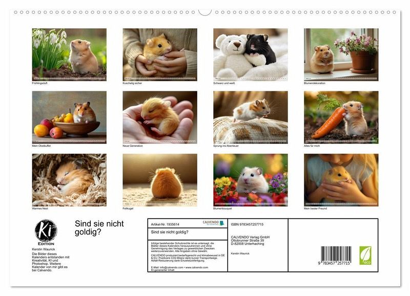 Dieser Kalender zeigt eine bezaubernde Sammlung von Goldhamstern in drolligen Bildern, die mit modernster KI-Technologie erstellt wurden. Jeder Monat präsentiert die niedlichen und einzigartigen Momente eines Goldhamsters, von verspielten Posen bis hin zu ruhigen Augenblicken der Entspannung. Durch die Kraft der KI entstehen lebendige und fotorealistische Darstellungen dieser flauschigen Begleiter. Ein Kalender, der die Liebe und den Charme dieser kleinen Tiere auf eine neue, kreative Weise einfängt.