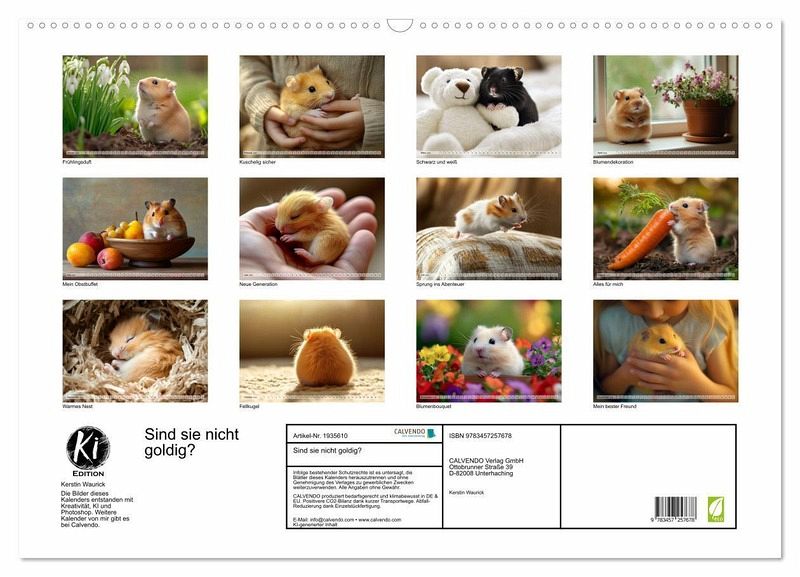 Dieser Kalender zeigt eine bezaubernde Sammlung von Goldhamstern in drolligen Bildern, die mit modernster KI-Technologie erstellt wurden. Jeder Monat präsentiert die niedlichen und einzigartigen Momente eines Goldhamsters, von verspielten Posen bis hin zu ruhigen Augenblicken der Entspannung. Durch die Kraft der KI entstehen lebendige und fotorealistische Darstellungen dieser flauschigen Begleiter. Ein Kalender, der die Liebe und den Charme dieser kleinen Tiere auf eine neue, kreative Weise einfängt.