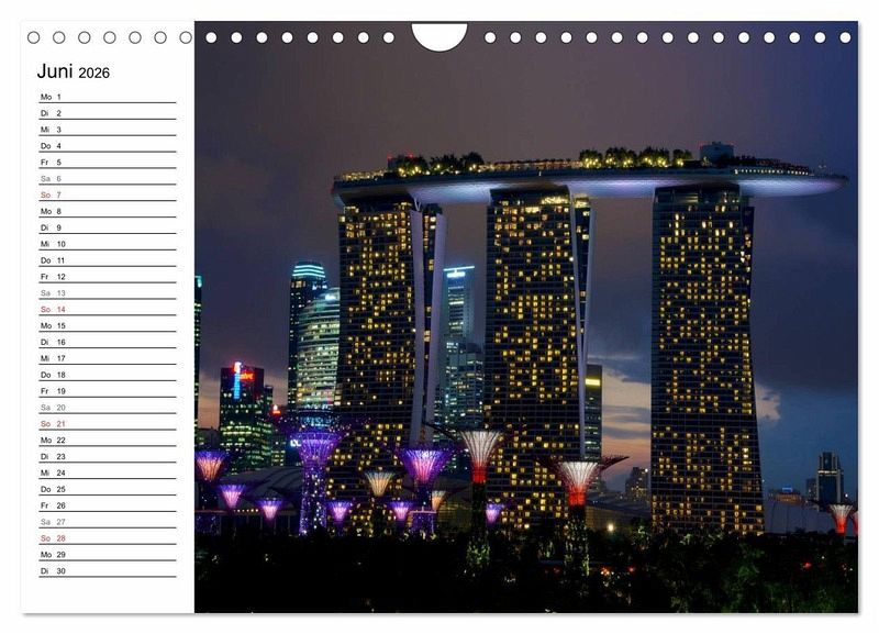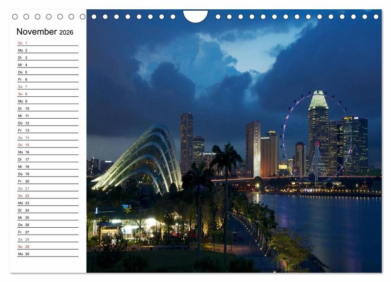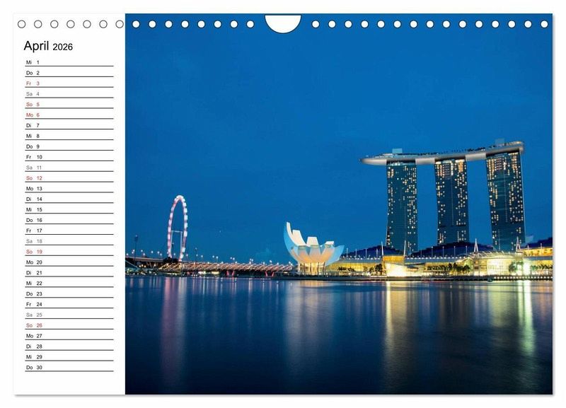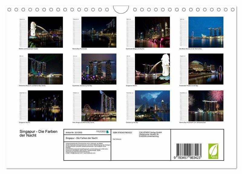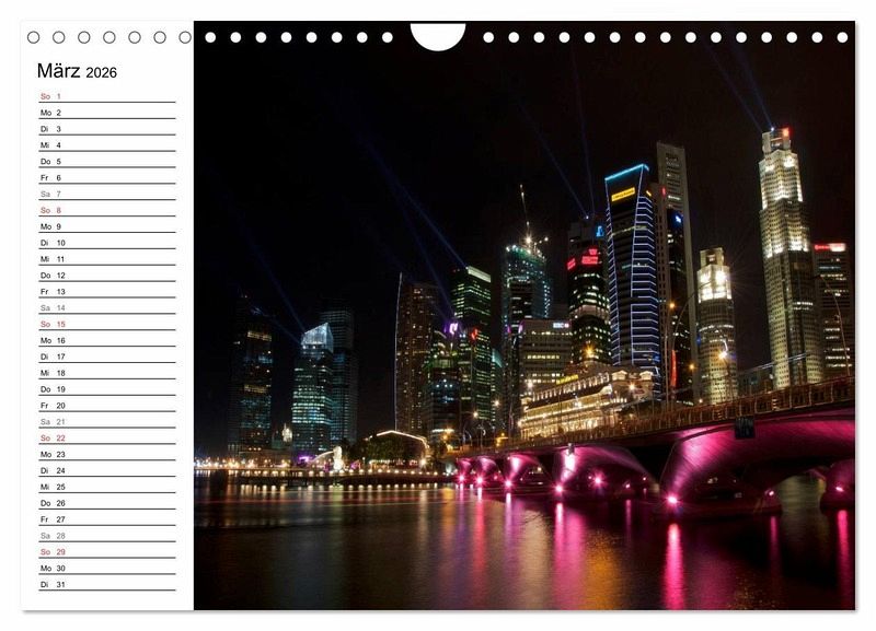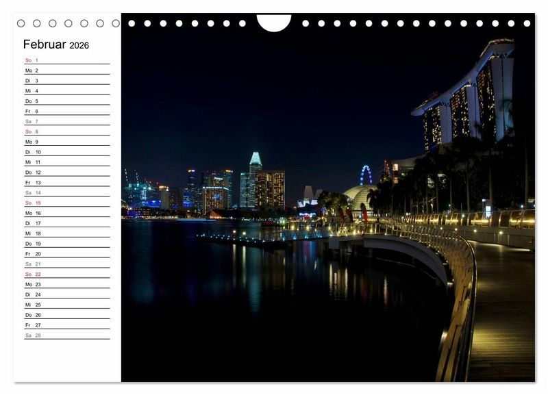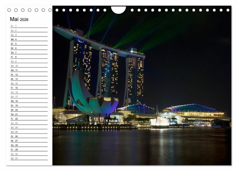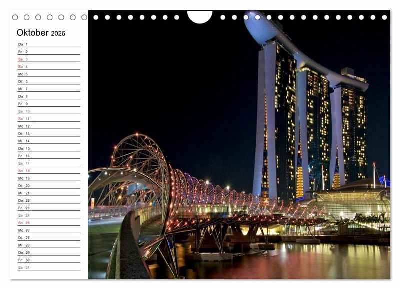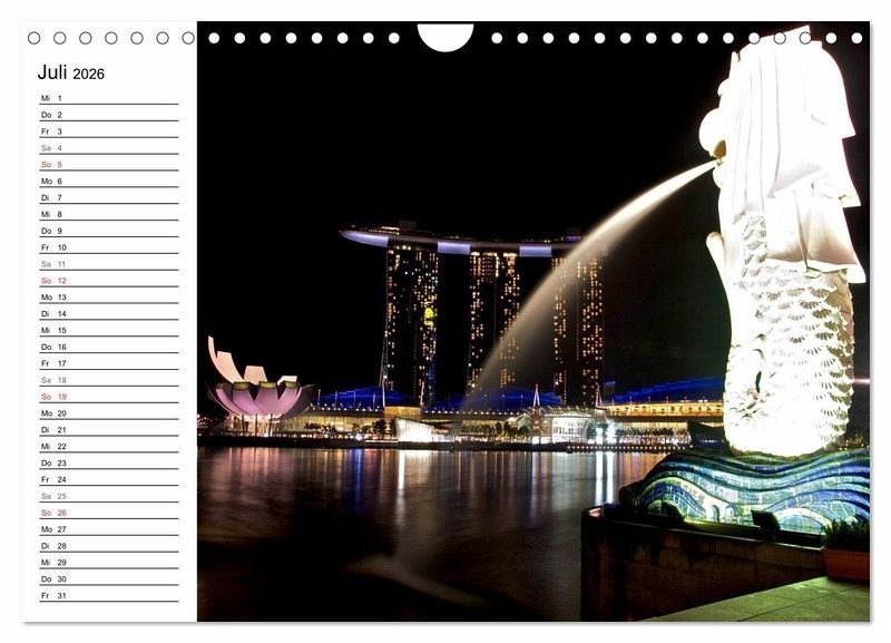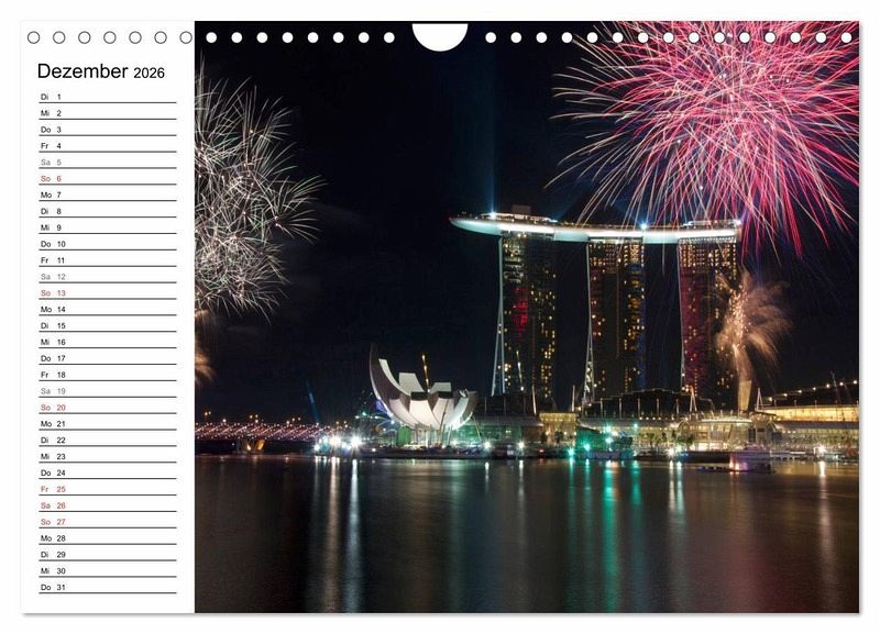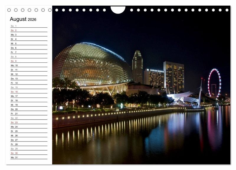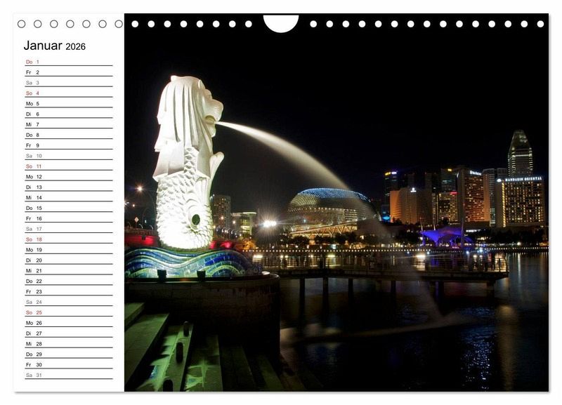 Der beliebte Singapur Kalender ist jetzt auch als Planer erhältlich. Die Republik Singapur ist flächenmässig der kleinste Staat in Südostasien und ein beliebtes Reiseziel für Reisende aus der ganzen Welt. Jedes Jahr kommen millionen Menschen in die asiatische Metropole um die Einzigartigkeit Singapurs zu erleben. Endecken Sie die Farbenvielfalt und die faszinierende Skyline von Singapur bei Nacht in diesem einzigartigen Kalender. Der ideale Planer für die ganze Familie.