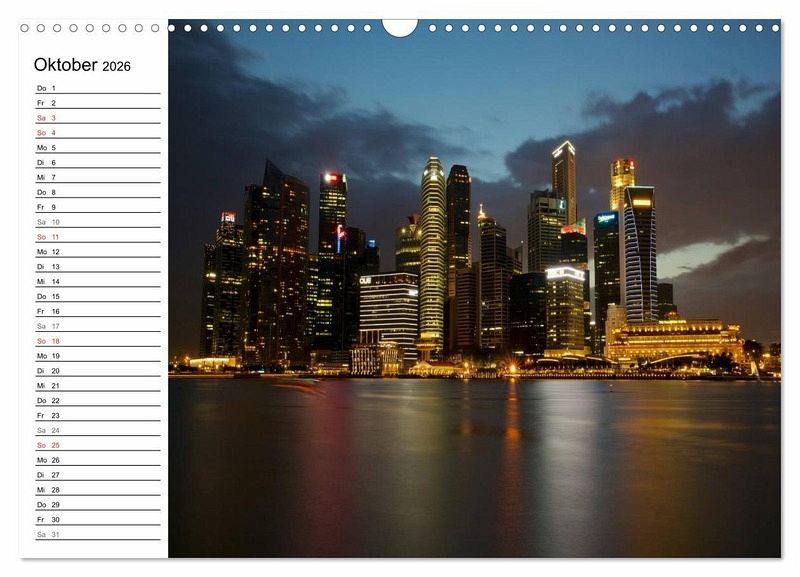 Ein Familienplaner mit beeindruckenden Fotografien der unterschiedlichen Skylines von Singapur. Jedes Jahr kommen Reisende aus der ganzen Welt in die asiatische Metropole um die Einzigartigkeit Singapurs zu erleben. Singapur beeindruckt durch seine vielfältige Architektur und das Leben mit der Natur. Entdecken Sie jetzt mit diesem einzigartigen Kalender die Vielfalt der faszinierenden Skylines von Singapur bei Tag und bei Nacht. Mit diesem Kalender erhalten Sie einen idealen Familienplaner / Geburtstagskalender mit einzigartigen und abwechslungsreichen Aufnahmen der Republik Singapur.