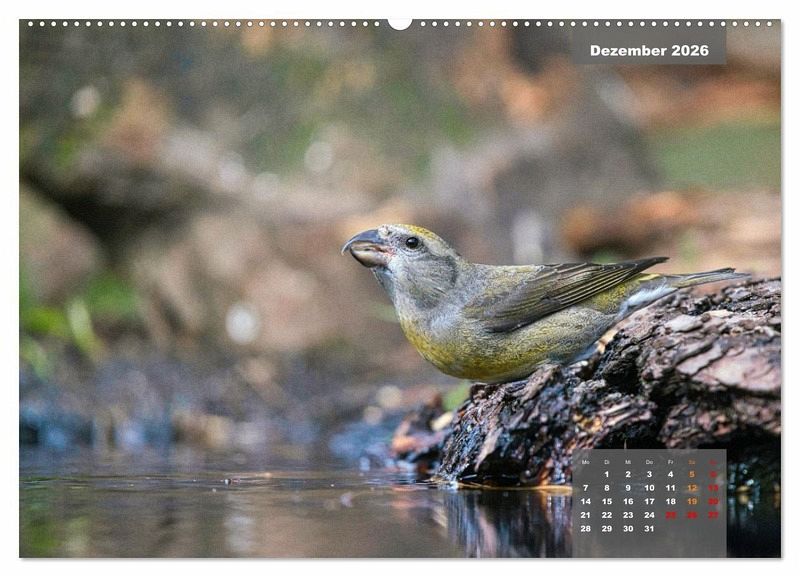 Dezember: Ein FICHTENKREUZSCHNABEL Weibchen beim Trinken