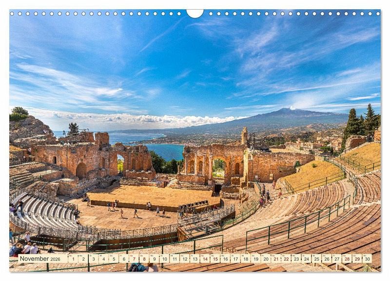 November: Griechiches Theater in Taormina mit Äthna im Hintergrund.