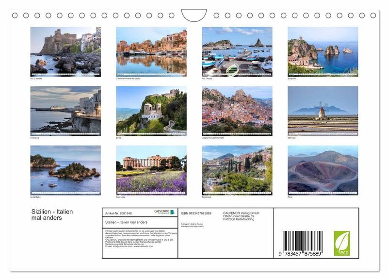 QUALITÄT - Hochwertiger Fotokalender mit 12 wunderschönen Motiven auf lichtbeständigem Bilderdruckpapier, robuste Spiralbindung mit Aufhängebügel.NACHHALTIG - deutliche Abfallreduzierung durch bedarfsgerechte Einzelstückfertigung, umweltfreundliches FSC-zertifiziertes Papier, Produktion in Deutschland, klimabewusste Logistik.PERFEKTES GESCHENK - Kalender für Freunde und Familie, für Kinder und Erwachsene, jung und alt, zu Weihnachten, Geburtstag oder zwischendurch.VIELFALT - Bildkalender in verschiedenen Formaten, z.B. DIN A5, DIN A4, DIN A3 sowie DIN A2. Ob Naturmotiv, Gemälde oder Fotos, ideal für ein persönliches Wohlfühlambiente.Eine traumhafte Fotoreise durch das andere Italien - das sonnige Sizilien von Autor(in): Joana Kruse