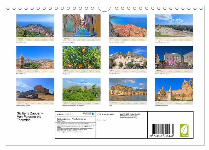 Erleben Sie die Magie Siziliens in zwölf faszinierenden Bilder. Dieser Kalender entführt Sie Monat für Monat auf die sonnenverwöhnte Mittelmeerinsel - wo das Meer in tiefem Blau glitzert, Orangenhaine duften und der Ätna majestätisch über die Landschaft wacht. Ob goldene Strände, verwinkelte Altstädte oder leuchtende Sonnenuntergänge - jede Aufnahme erzählt von der Schönheit, Vielfalt und Lebensfreude Siziliens. Perfekt für alle, die das mediterrane Flair lieben und sich das ganze Jahr über ein Stück -Dolce Vita- nach Hause holen möchten.