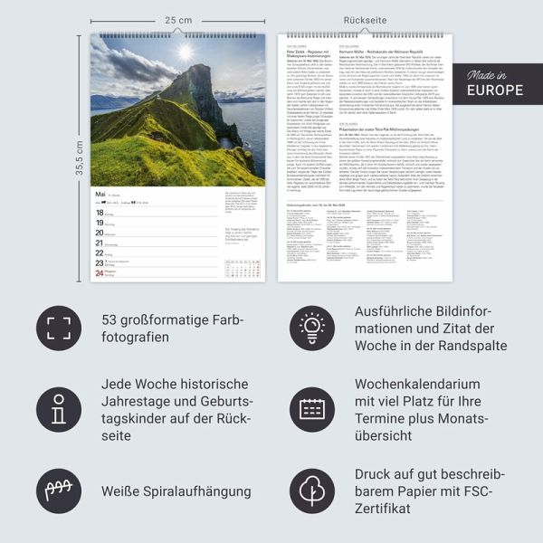- Fernweh garantiert: Naturkalender mit 53 magisch-schönen Aufnahmen ursprünglicher Landschaften- Einsame Seen, endlose Wälder, faszinierendes Licht: Wandkalender 2026 mit atemberaubender Landschaftsfotografie- Immer den Überblick behalten: Terminkalender zum Aufhängen mit viel Platz für Eintragungen sowie Bilderläuterungen und Wochen-Chronik auf den Rückseiten- Dafür findet sich ein Plätzchen an jeder Wand: Wochenplaner im platzsparenden Hochformat 25 x 35,5 cm- Jahr für Jahr neue Sehnsuchtsorte entdecken und gut organisiert sein mit den Harenberg-Wochenplanern aus dem Athesia Kalenderverlag