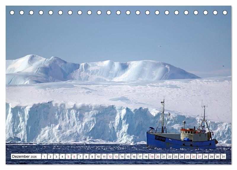 Dezember: Grönland: Fischerboot vor Eisbergen in Ilulissat