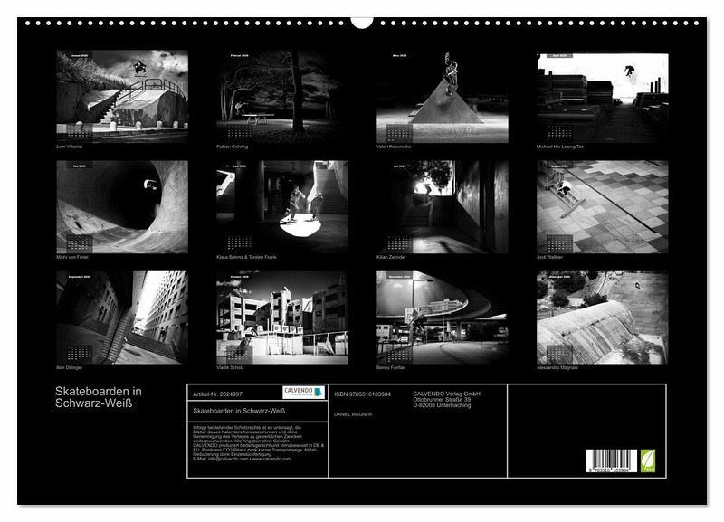 Skateboarden in Schwarz-Weiß ist ein Kalender des Stuttgarter Skateboardfotografen Daniel Wagner. Er zeigt 12 seiner besten Fotografien von nationalen und internationalen Skateboardgrößen in klassischem Schwarz/Weiss und einer einzigartigen Bildsprache.