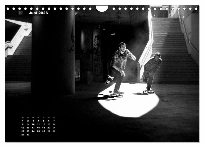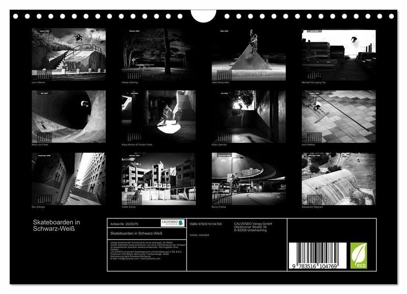 Skateboarden in Schwarz-Weiß ist ein Kalender des Stuttgarter Skateboardfotografen Daniel Wagner. Er zeigt 12 seiner besten Fotografien von nationalen und internationalen Skateboardgrößen in klassischem Schwarz/Weiss und einer einzigartigen Bildsprache.