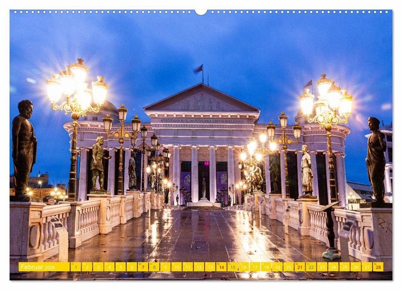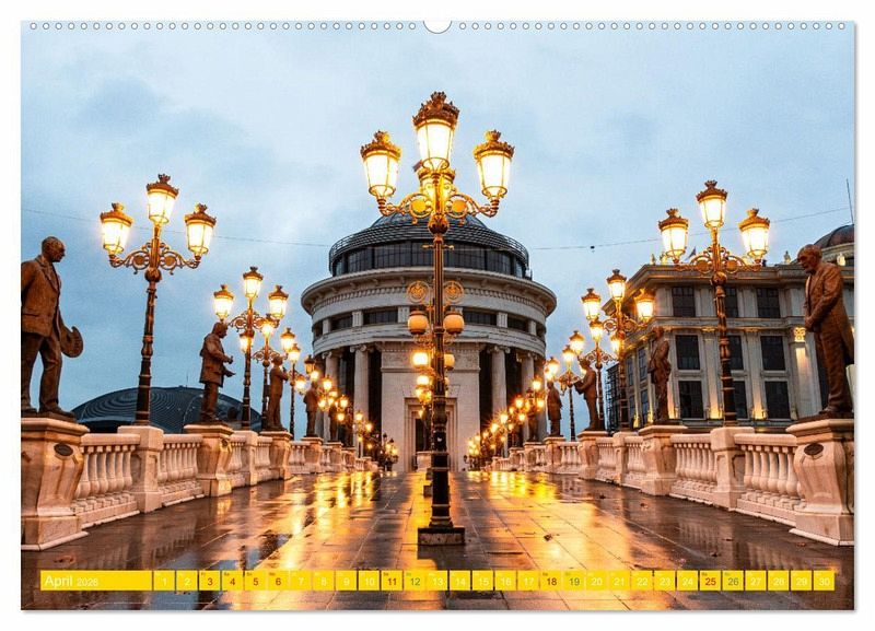 April: Abendlicher Blick auf der "Brücke der Kunst" in Skopje