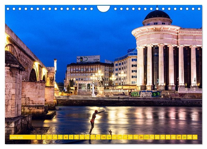 April: Abendlicher Blick auf der "Brücke der Kunst" in Skopje