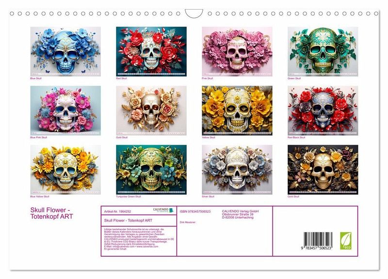 Entdecken Sie den einzigartigen Wandkalender "Skull Flower - Totenkopf ART" und tauchen Sie ein in eine faszinierende Welt der Kontraste! Dieser außergewöhnliche Kalender vereint die Schönheit der blühenden Natur mit der Mystik und Ästhetik von Totenköpfen.Jeder Monat präsentiert Ihnen eine einzigartige Kreation, bei der sich zarte Blumen und kunstvoll gestaltete Totenköpfe zu einer harmonischen Einheit verbinden. Die detailreichen Illustrationen erzählen ihre ganz eigene Geschichte und ziehen den Betrachter in ihren Bann.Der "Skull Flower - Totenkopf ART" Kalender ist nicht nur ein Blickfang in jedem Raum, sondern auch ein perfektes Geschenk oder Mitbringsel für Kunstliebhaber, Individualisten und Menschen, die das Besondere suchen. Egal, ob für Geburtstage, Weihnachten oder als Dankeschön - dieser Kalender wird garantiert für Freude und Bewunderung sorgen.Hochwertiges Papier und eine sorgfältige Druckqualität garantieren, dass Sie jeden Monat lange Freude an den beeindruckendenMotiven haben werden.Lassen Sie sich von der einzigartigen Kombination aus Schönheit und Mystik verzaubern und holen Sie sich den "Skull Flower - Totenkopf ART" Kalender für sich selbst oder Ihre Liebsten. Tauchen Sie ein in eine Welt voller Kontraste und lassen Sie Ihre Wände erblühen!Bestellen Sie noch heute und machen Sie sich selbst oder jemand anderem eine Freude mit diesem außergewöhnlichen Wandkalender. Erstellt wurde er mit viel Kreativität, Ki und Photoshop durch den Künstler Dirk Meutzner.