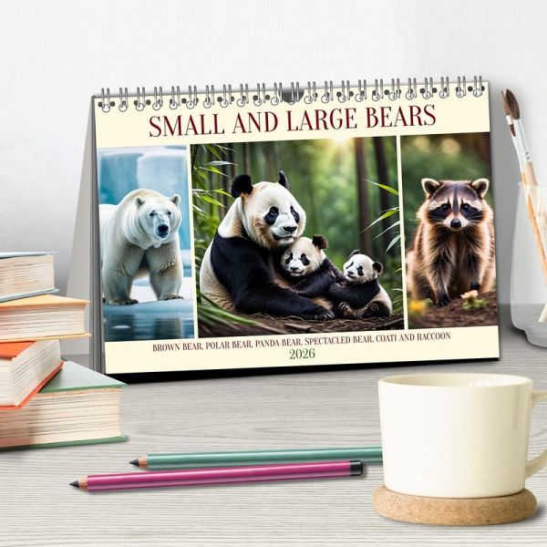 QUALITY - High-quality photo calendar with 12 beautiful images on light-resistant paper, robust spiral binding.SUSTAINABLE - Significant waste reduction due to print-on-demand production, environmentally friendly FSC-certified paper, produced locally, climate-conscious logistical processes.PERFECT GIFT - calendars for friends and family, for children, all ages and all occasions, from Christmas to birthdays and everything in between.LOTS OF CHOICE - Wall calendars in different sizes (DIN A4 and DIN A3), for any topic and personal taste, featuring photography, painting and illustrations.Brown bear, Polar bear, Panda bear, Spectacled bear, Coati and Raccoon von Autor(in): Claudia Kleemann