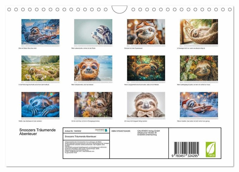Lassen Sie sich Monat für Monat von Snoozer verzaubern, während er in seinen liebenswerten, trägen Posen die Kunst der Entspannung zelebriert. Dieser Kalender ist nicht nur ein visueller Genuss, sondern auch eine tägliche Erinnerung daran, das Leben ein wenig langsamer anzugehen und die kleinen Momente zu genießen. Alle hier gezeigten Bilder wurden mit Sorgfalt, Liebe und mit Hilfe einer KI generiert. Abschließend werden sie mit Bildbearbeitungsprogrammen überarbeitet und in den Kalender eingefügt.