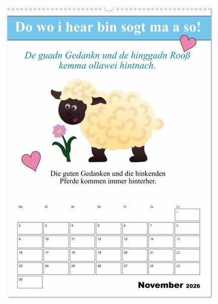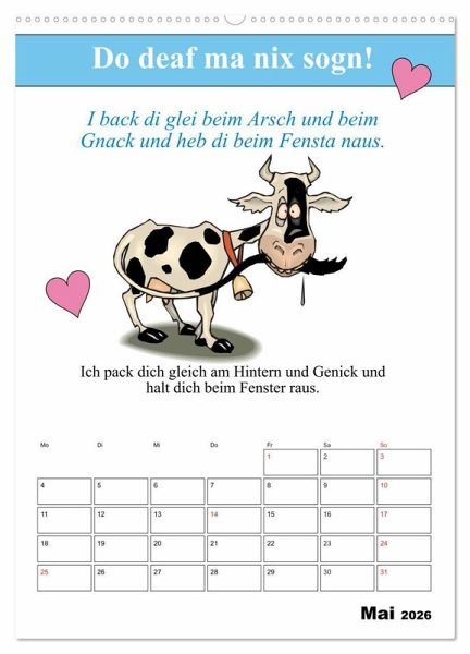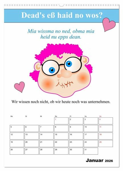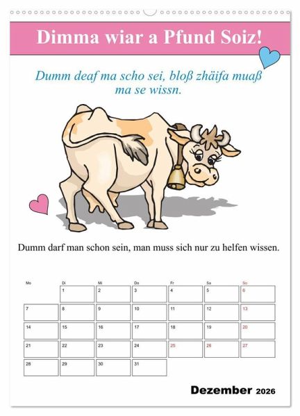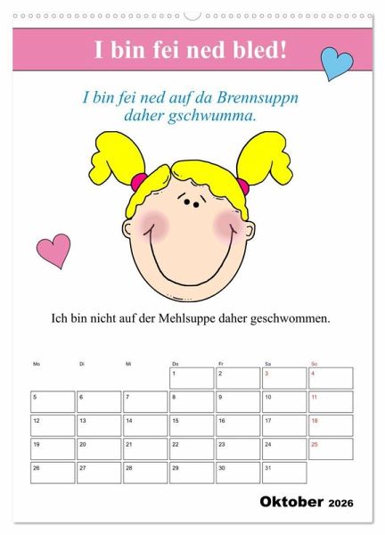 Die bairische Mund- und Redensart ist nicht nur ein echtes Kulturgut, sie macht richtig Spaß beim zuhören und natürlich beim selbst ausprobieren. Ein witziger Cartoon-Kalender mit bairischen Sprüchen.