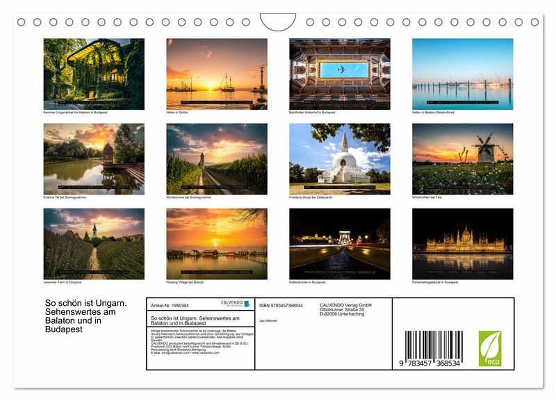 Entdecke Ungarns Schönheit! Tauche ein in die faszinierende Welt des Balatons und Budapests. Unser Kalender zeigt atemberaubende Bilder von den Sehenswürdigkeiten dieser bezaubernden Orte. Lass dich verzaubern und plane deine Reise mit unseren inspirierenden Aufnahmen. Erlebe den Sonnenuntergang am Balaton oder die majestätische Architektur von Budapest. Ein Must-Have für alle Ungarn-Liebhaber und Reiseenthusiasten! Bestelle jetzt und träume dich jeden Tag in das wundervolle Ungarn