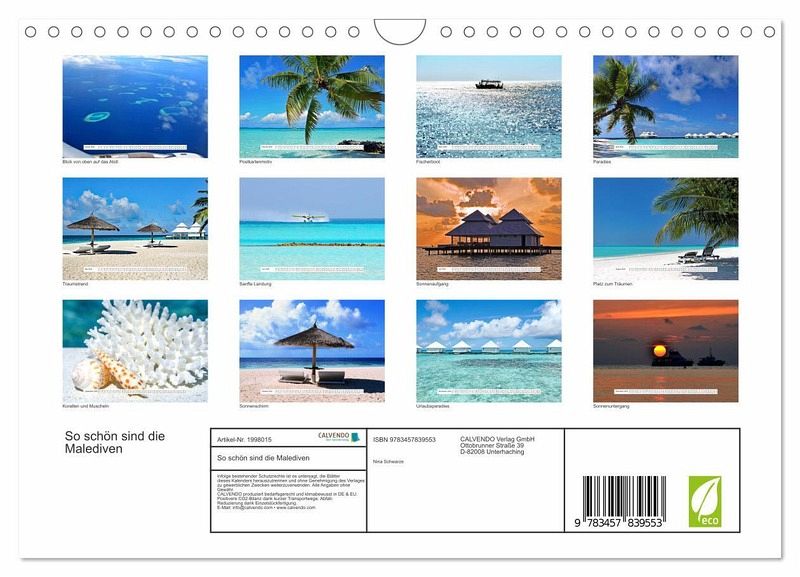 In diesem Kalender finden Sie einzigartige Bilder von den Malediven - ein traumhaftes Paradies im Indischen Ozean mit Puderzuckerweißen Stränden. Tief-türkis-blaues Meer und viele schattenspendende Kokospalmen laden ein zum Träumen. Entdecken Sie die außergewöhnliche und atemberaubende Natur der Inseln.