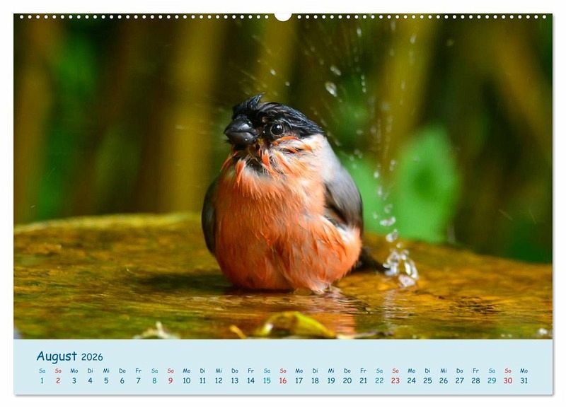 Dieser Kalender zeigt einheimische Singvögel beim spritzig-bunten Badevergnügen - eine Sammlung sommerlich-fröhlicher Motive für das ganze Jahr.
