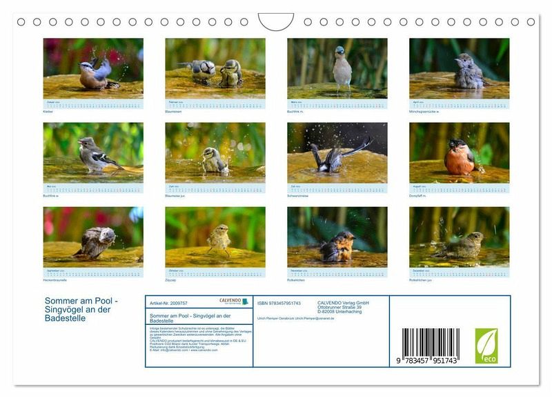 Dieser Kalender zeigt einheimische Singvögel beim spritzig-bunten Badevergnügen - eine Sammlung sommerlich-fröhlicher Motive für das ganze Jahr.