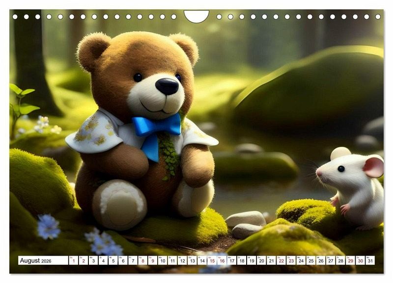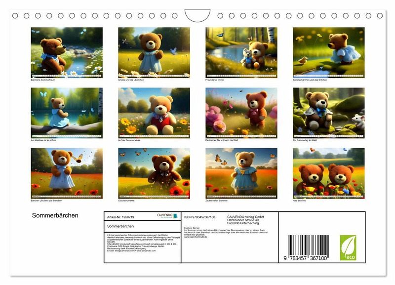 Im Sommer sitzen die kleinen Bärchen auf der Blumenwiese oder an einem Bach, freuen sich über Bienchen und Schmetterlinge oder ein niedliches Entchen und sind einfach nur glücklich, und ich mit ihnen, denn alle Bilder in diesem zauberhaten Kalender sind mit künstlicher Intelligenz entstanden. Dabei habe ich meine Texte in Bilder umwandeln lassen. Das Ergebnis ist einzigartig. Ich bin begeistert und wünsche viel Freude damit allen großen und kleinen Bärchenfreunden.