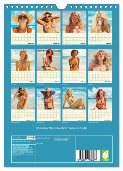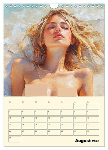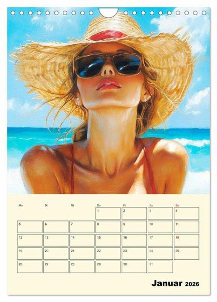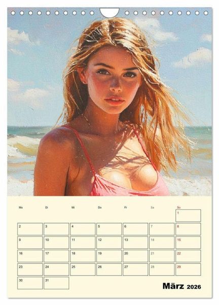 Dieser erotische Frauen-Kalender präsentiert sinnliche und starke Frauen am Strand. Alle Bilder sind im kunstvollen Ölgemälde-Stil und wurden mit Hilfe von KI erstellt. Jede Illustration fängt die ungezähmte Schönheit und das selbstbewusste Auftreten von Frauen im Sommer ein, während sie Wind, Sand und Meer genießen. Ein Kalender für alle, die die Verbindung von Sinnlichkeit, Kunst und Natur schätzen.